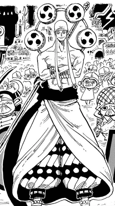 - ↑ 3,0 3,1 3,2 Vivre Card - One Piece Visual Dictionary , Раскрыта информация о Энеле.