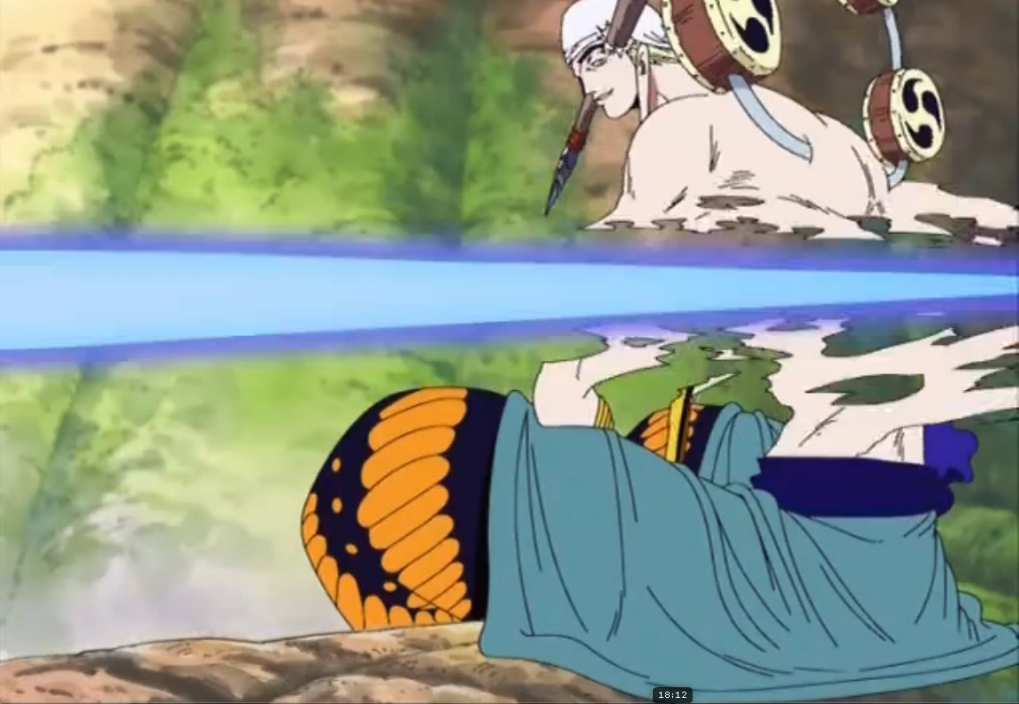 Глава 264 (стр. 10-11) и Эпизод 173, Энелю становится скучно во время битвы с Камакири.