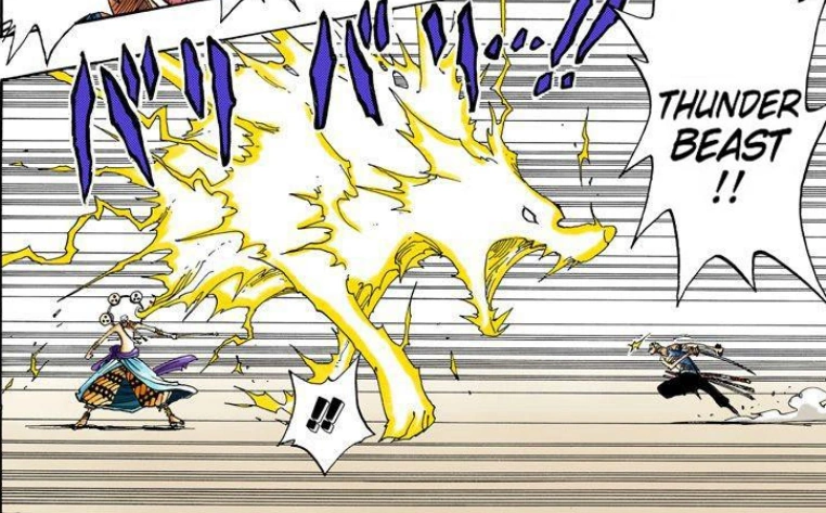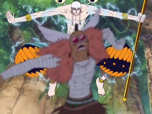 Используя способности своего Дьявольского Плода, Энель способен превращаться в гигантского Райдзин-подобного Бога грома, состоящего из чистейшего электричества.