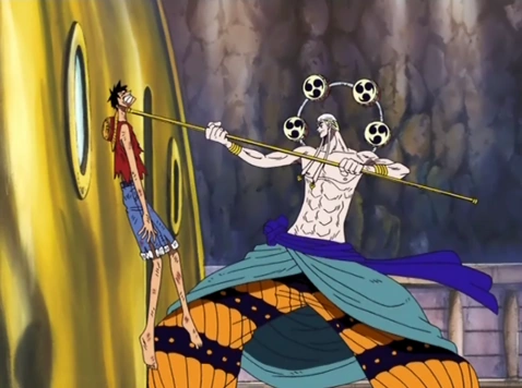 До того как появился Луффи, сила его Плода а также способности Мантры, казалось бы сделали его абсолютно бесстрашным и вместе с неуязвимостью породили в нём так называемый Комплекс Бога. Но после того как Луффи стал одерживать верх в битве, Энель постарался избавится от него, рассматривая его как угрозу, а также чтобы вернуть свой статус «Непобедимого». Однако, с этого момента Энель стал действовать более трусливо и несколько неуверенно, стараясь изо всех сил избежать повторного противостояния с Луффи.