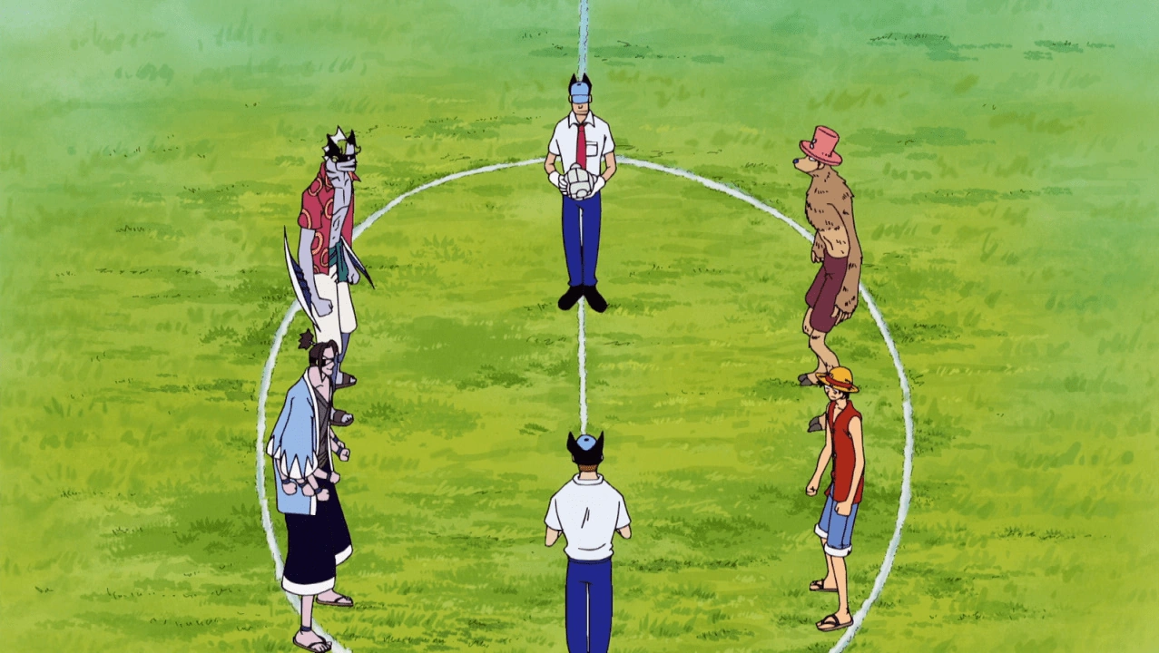 На поле со стороны Пиратов Фокси остался только их капитан и Гамбург. Однако благодаря своим способностям Робин с легкостью выводит Гамбурга из игры. Нами подбирает мяч и передает его Санджи, который отвлекается на девушек из команды противников и отдает им мяч. По просьбе Порче он с радостью подставляется под удар и выходит из игры. Фокси использует установку Смертельный удар. Порче же использует на Пиратах Соломенной Шляпы гипноз, и Фокси стреляет мячом из установки, но на Зоро это не действует, и он с легкостью разрезает летящий мяч пополам. За это его дисквалифицируют. Команда Фокси получает новый мяч и стреляет им в Луффи, но тот с легкостью уходит из-под удара.