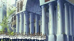 Глава 674 (стр. 17) и Эпизод 600, пираты Кида смотрят трансляцию Цезаря.