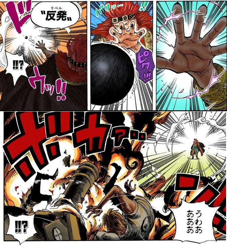 反発 Рипэру?, дословно означает «отталкивание»): Кид отражает любой металлический материал, направленный в него или находящийся по близости, в обратную от себя сторону. Впервые он применил эту технику на аукционе, где отразил летевшее в него пушечное ядро дозорных[34].