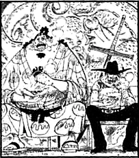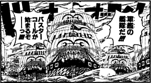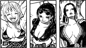 O: Ага. Похоже, речь идет о датабуке One Piece Green, в котором были опубликованы мои каракули. В одних случаях процесс создания персонажей занимал у меня годы, я мог много раз рисовать, перерисовывать и дорабатывать их перед тем, как они официально появлялись в манге. В других случаях я мог набросать внешний вид какого-нибудь персонажа за пару минут. Пираты Чёрной Бороды относятся к первой категории. Я перерисовал их внешность много раз, и результатом моей работы стали лица, которые сразу дают понять, кто перед вами. Если вам интересно, почему я убрал всю красоту, то это для того, чтобы Пираты Чёрной Бороды соответствовали “пиратской тематике”. Огромные, грубые, вульгарные. Если бы среди них было что-то красивое, оно бы испортило все впечатление. Поэтому они такие, какие есть.