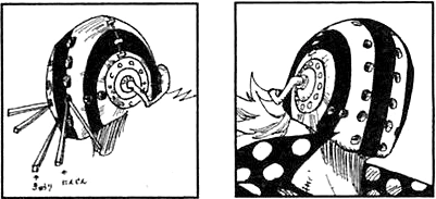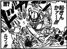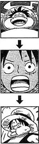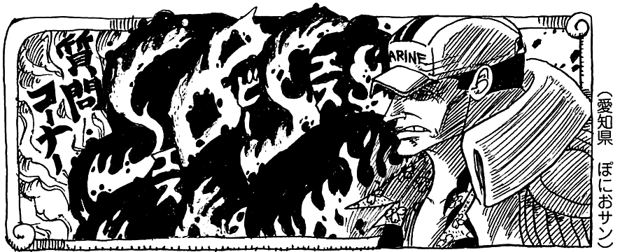 Ч: Я обнаружила кое-что странное, мисс (этот читатель обращается к Оде как к женщине-соседке). В 51 томе, когда Луффи впервые попал на Сабаоди, он наелся такояки и стал очень толстым, потом внезапно похудел, а на следующей странице снова стал толстым. Как такое возможно?! Это из-за того, что он резиновый?! Мне так интересно, что я не могу вернуться к себе домой в космос. Пожалуйста, ответьте. Подпись: Космический бот №6, 14-лет, девочка.