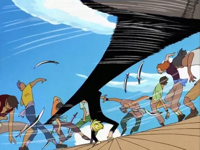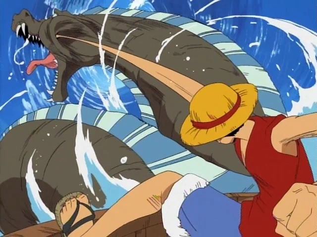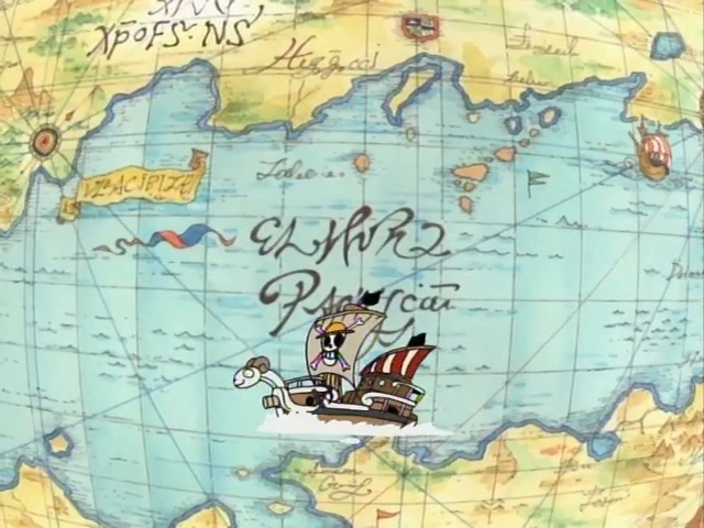 Гоинг Мерри плывёт по бушующим волнам в окружении огромных Морских Королей. Затем показана носовая часть корабля со всей командой на палубе и Луффи, свисающим с носовой фигуры вверх ногами. Луффи ухмыляется, смотря на Морских Королей. Затем, Мерри путешествует по волнам, подпрыгивая в воздух, в то время как на фоне показана карта.