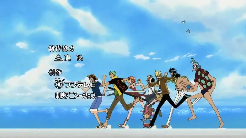 Показан Луффи, бегущий вверх по холму и прыгающий с его вершины. Один за другим мелькают портреты членов экипажа: суровый взгляд Зоро, машущая рукой Нами, Усопп со скрещенными руками и Санджи с сигаретой. Луффи оттягивает свою руку и запускает её в сторону Гоинг Мерри, цепляясь за мачту и притягивая себя к кораблю. Луффи летит в сторону камеры, и появляется логотип сериала поверх старой карты.