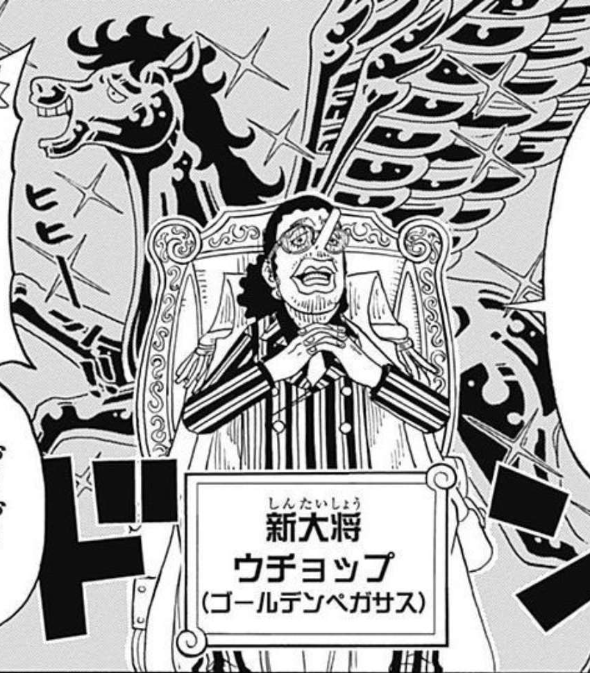 - In the gag manga One Piece Party, Usopp, under the alias Uchopp (ウチョップ, Uchoppu?), was temporarily promoted to an Admiral. During his short time in the role, he was given the alias Golden Pegasus (ゴールデンペガサス, Gōruden Pegasasu?).[36]