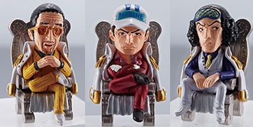 The Admirals have been featured sparingly in the fan merchandise. All three are set to be featured in the One Piece Super Deformed Figures, One Piece Super Effect Devil Fruit User, and One Piece Figuarts Zero figure series.