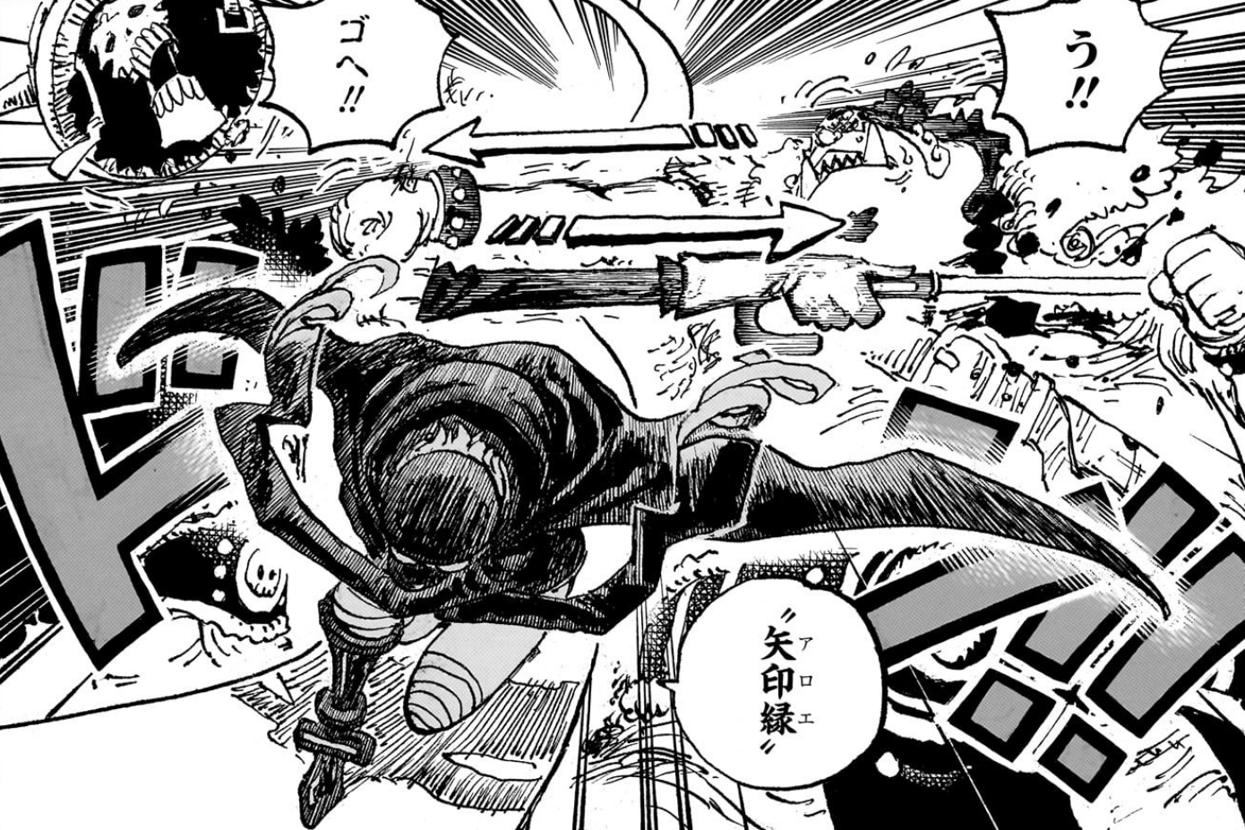 矢印縁 , Aroe?, literally meaning "Arrow Fate"): Gunko extends strips from her sleeves, taps her targets with these strips, and then creates arrows that redirect her targets' attacks. This was first seen used against Jinbe and Brook to make them hurt each other.[15] The name of the technique is likely a pun on aloe and "Arrow".