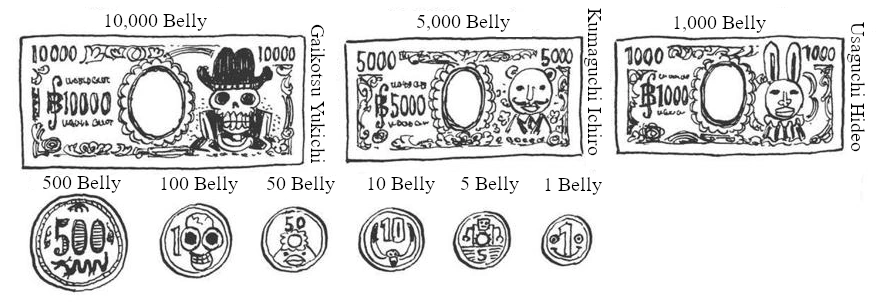 In both denomination and appearance, the Belly is an almost one-to-one parody of the modern Japanese yen. The banknote personages, in particular, spoof the historical figures on yen notes: