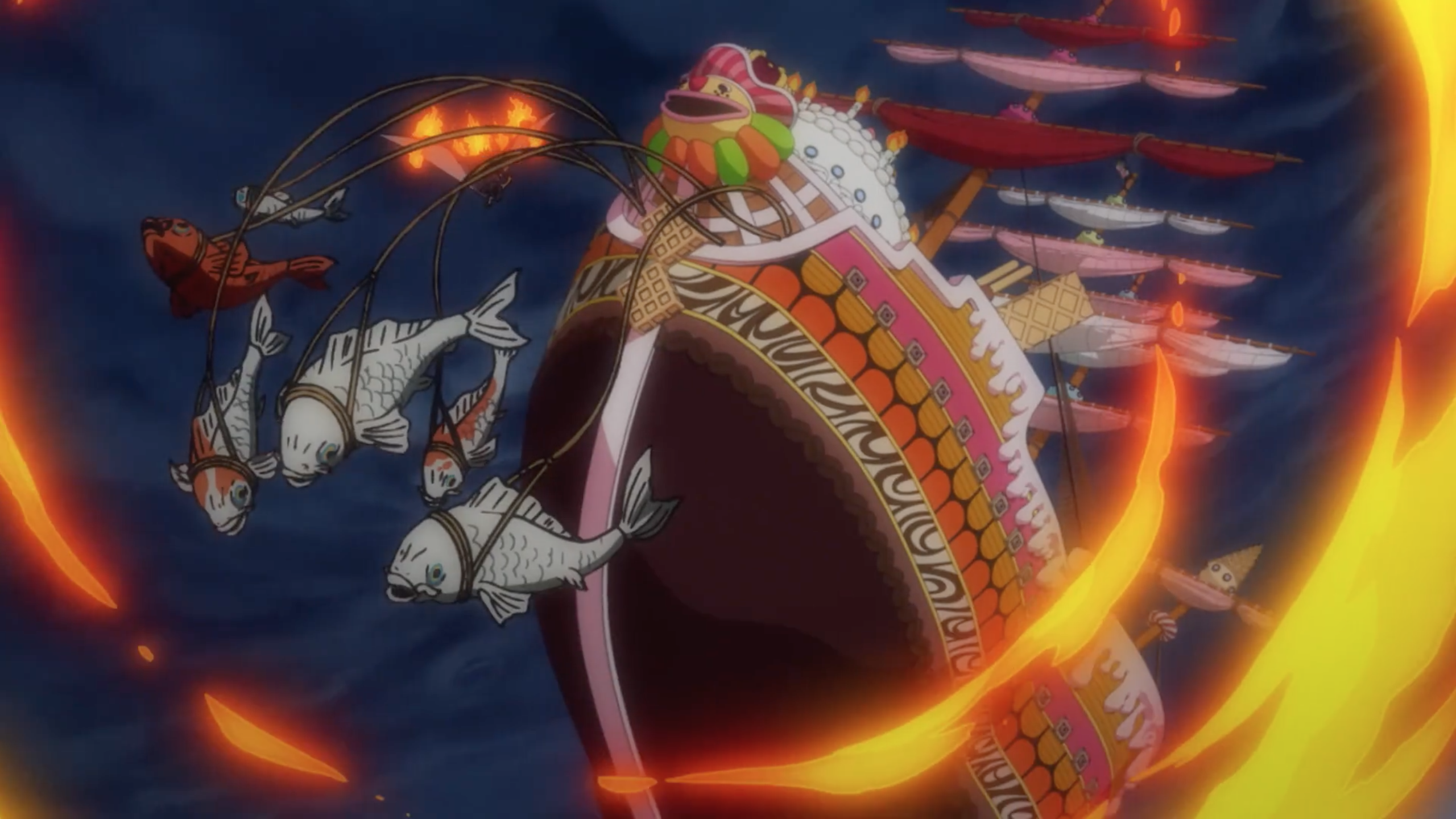 - ↑ One Piece Manga and Anime — Vol. 88 Chapter 887 and Episodes 860–861, As the cooks and the Fire Tank Pirates set sail, the Big Mom Pirates reach the Sunny.