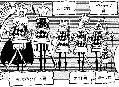 If combatants prove themselves to be trustworthy, they are assigned a rank. No family members, with the technical exception of Capone Bege, have an appointed rank, which may indicate that the ranking system is designed specifically for crew members that are not related to Big Mom by blood. The rankings follow the pieces of a chess game. They include: