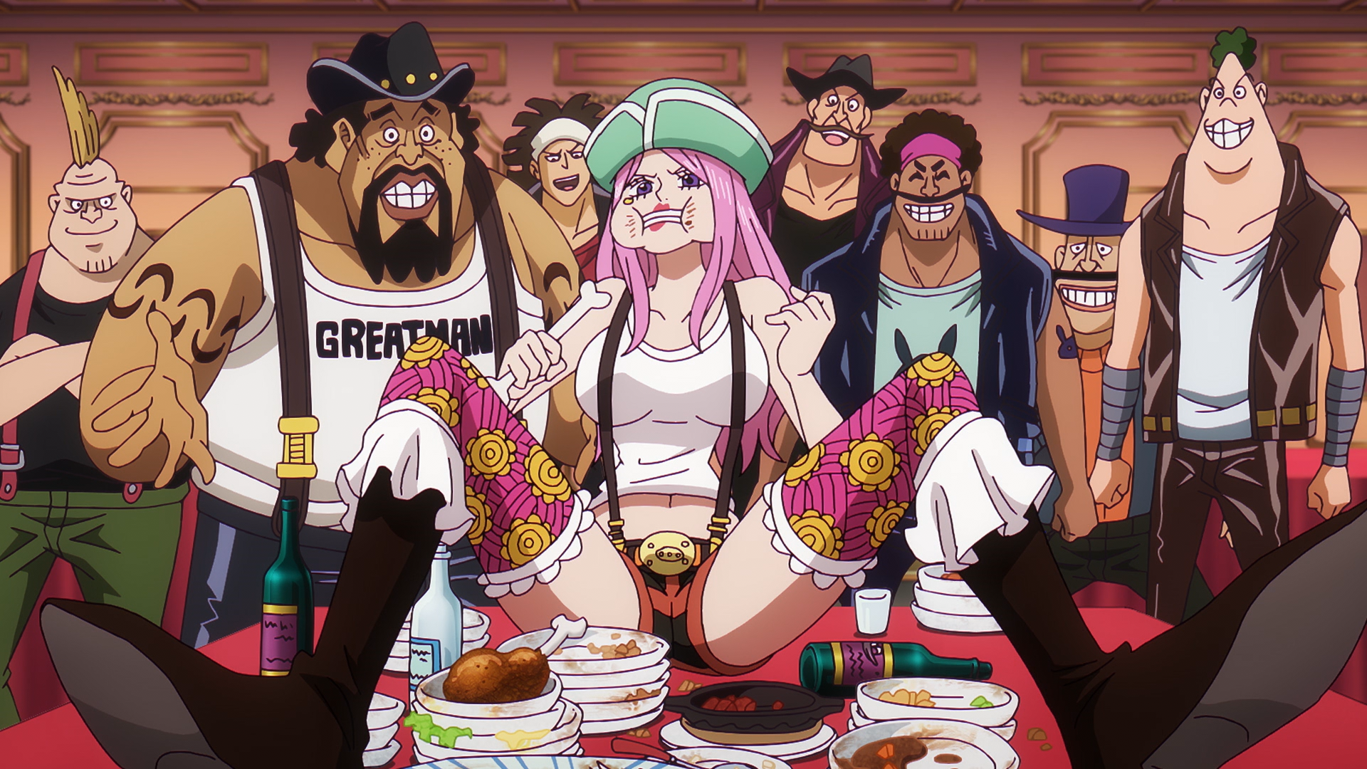 - A third crew member has a very thin handlebar mustache and wears a cowboy hat alongside a tank top and suspenders. He appears in Chapters 498 and 507.