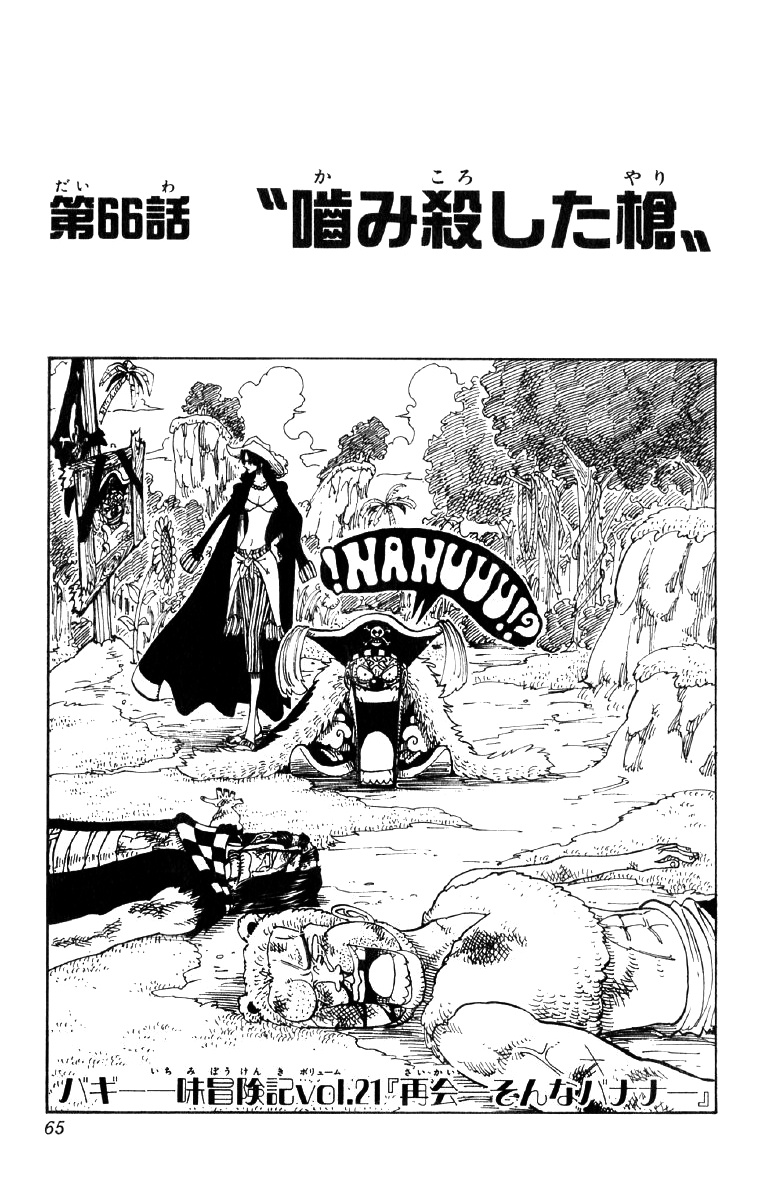 Buggy reaches an island and hunts down a bird for eating. However, a giant bird comes to the small one's protection and scares Buggy away. Buggy attempts to trap the bird using a pit, but the trap does not work and the bird prepares to eat Buggy. However, Buggy is spat out because of his bad taste. Buggy is sent flying and lands on another island populated by strange animals. The island is revealed to be the Island of Rare Animals, and Gaimon pursues Buggy. However, the two eventually make peace, because Gaimon thinks of Buggy as another strange animal.