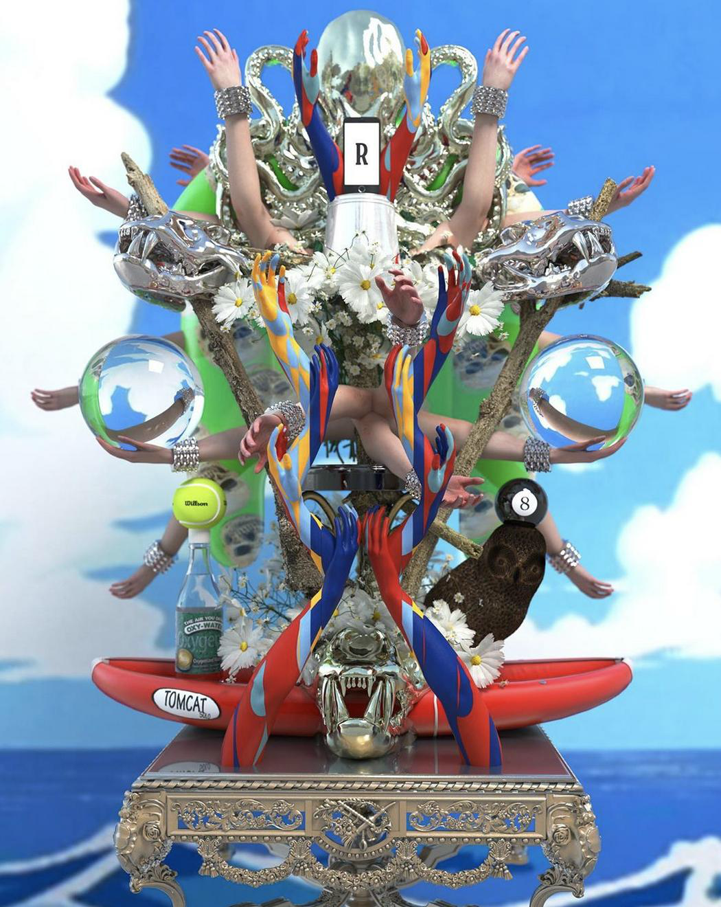 "Robin's sculpture" was created by Naoya Hirata. It is an abstract sculpture with many effigies of arms and hands stretching all over it, and it also features a random assortment of sculpted trinkets.[13]