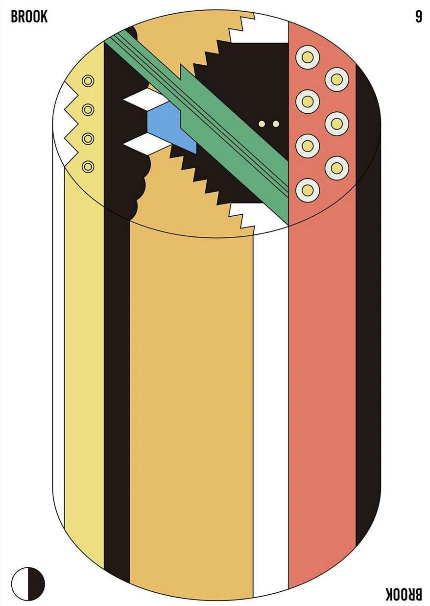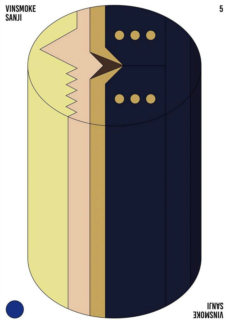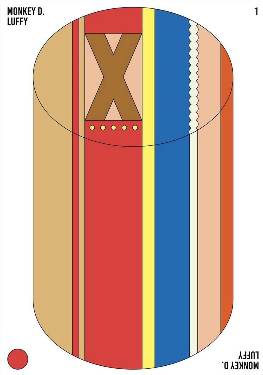 "CYLINDRICAL CANDY" was created by Kenzo Hara. It is a minimalist graphics piece that shows cylindrical representations of the first nine Straw Hat Pirates.