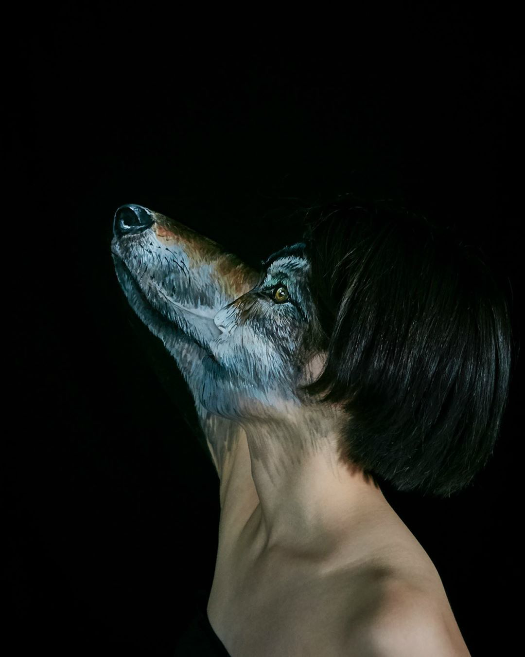 "Wolf" was created by Hikaru Cho. It is a photograph of Cho with her face and right arm painted. By bending her arm and holding it up to her face, Cho creates the illusion of having a wolf's muzzle.[18]