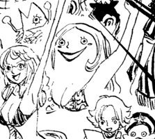 - ↑ One Piece Manga — Vol. 24 Chapter 225, cover story: Hatchan's Sea-Floor Stroll Vol. 38, Camie falls asleep alongside Hatchan and Pappag under the warmth of the setting sun.