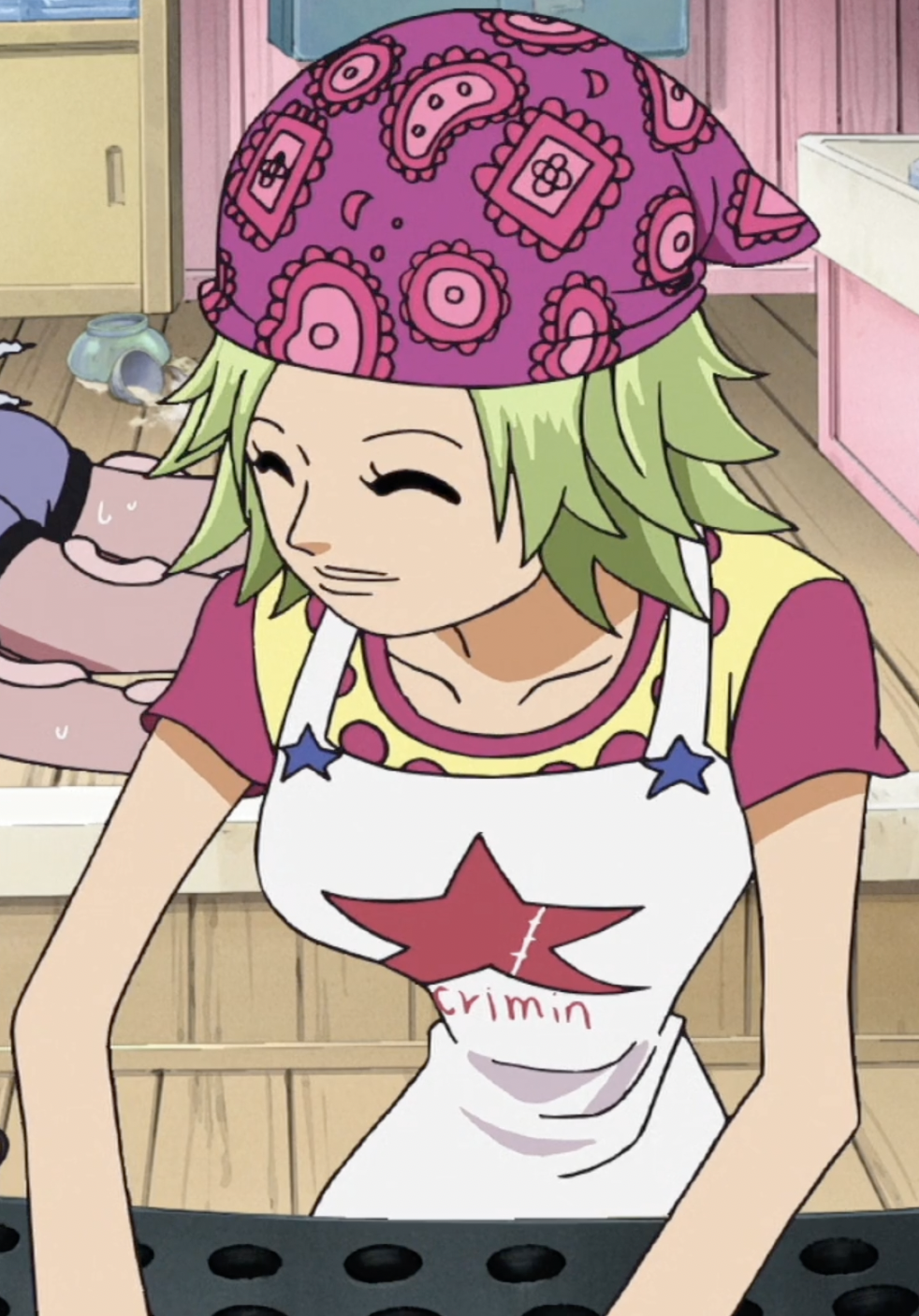 Camie is then seen at the coast with Hatchan and Pappag, saying goodbye to the Straw Hats as they head for the New World.
