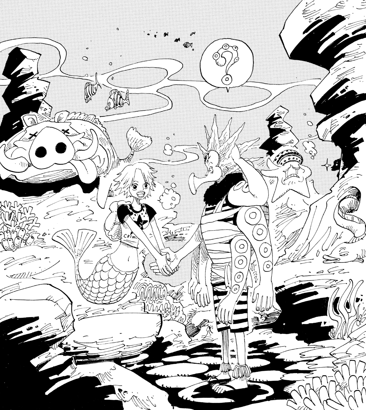 Sanji starts swimming with the mermaids as Camie, Luffy, Chopper, and Usopp relax. Luffy asks Camie if he can see Jinbe. When Camie informs Luffy that Jinbe is not present on the island, Luffy shows his disappointment as he was looking forward to meeting him. When the Medaka Mermaid Quintuplets inform Camie that a royal gondola is approaching, Camie tells the Straw Hats to hide. Luffy, Usopp, and Chopper hide behind rocks while Sanji is hidden from view by a mermaid. The three brothers of the Neptune House appear, searching for the people who entered Fish-Man Island illegally. The mermaids deny seeing any intruders.