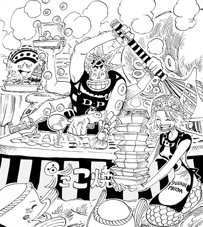 - ↑ One Piece Manga — Vol. 25 Chapters 227 and 228, cover story: Hatchan's Sea-Floor Stroll Vol. 39-40, Camie and everyone with her awakes to see Takoyaki 8 and Hatchan opens up a floating Takoyaki stand.