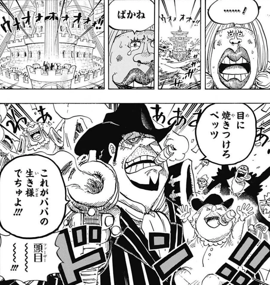 - ↑ One Piece Manga — Vol. 98 Chapter 988, cover story: "Gang" Bege's Oh My Family Vol. 32.