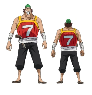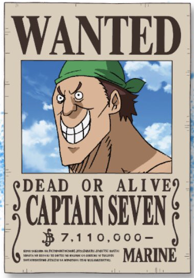 When Luffy and his allies defeated Bullet, Seven celebrated, hugging and dancing with Pandaman. After the members of the Worst Generation escaped from Delta Island, Seven and Donald Moderate were among many pirates arrested by the Marines.[1]