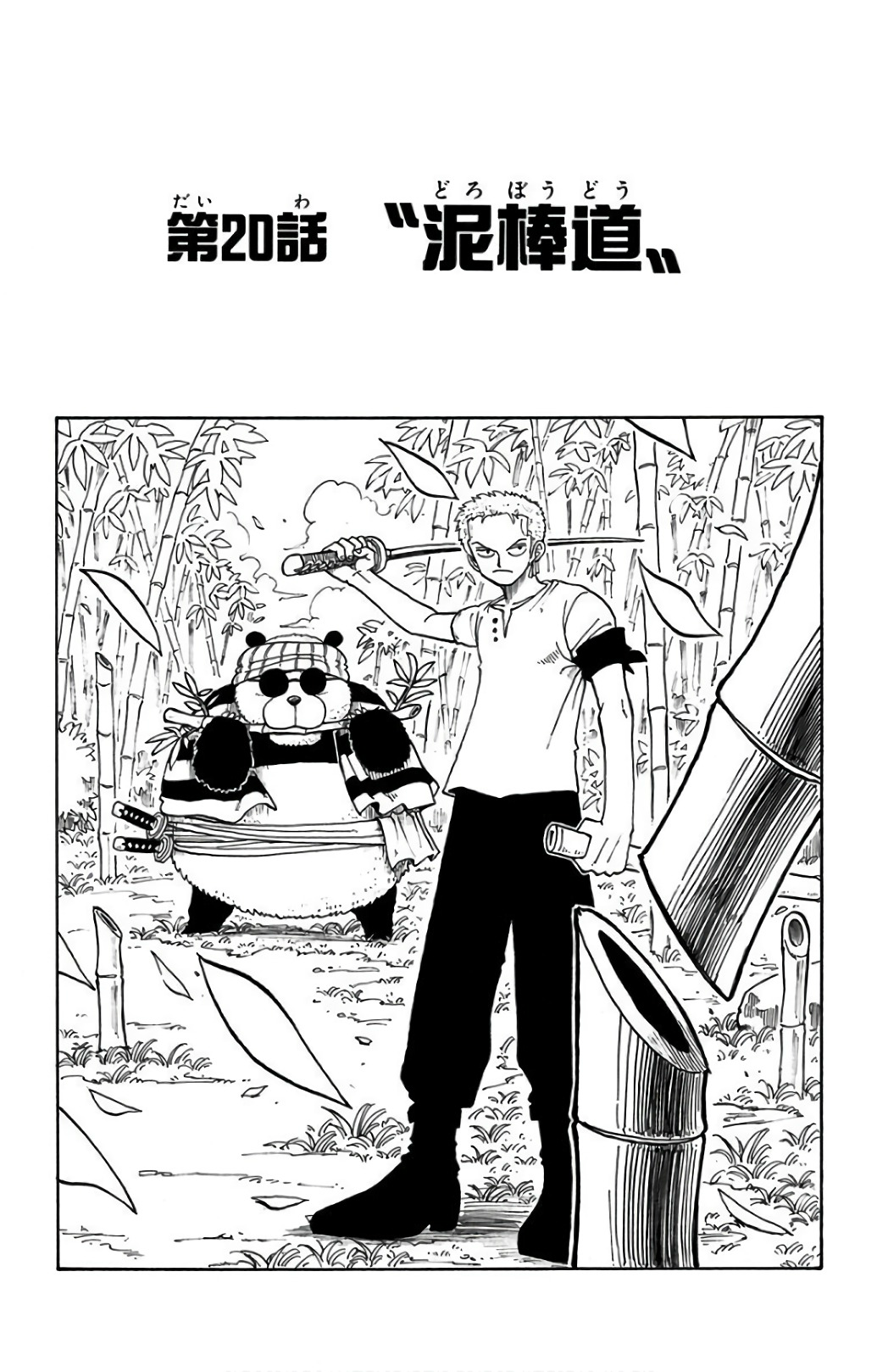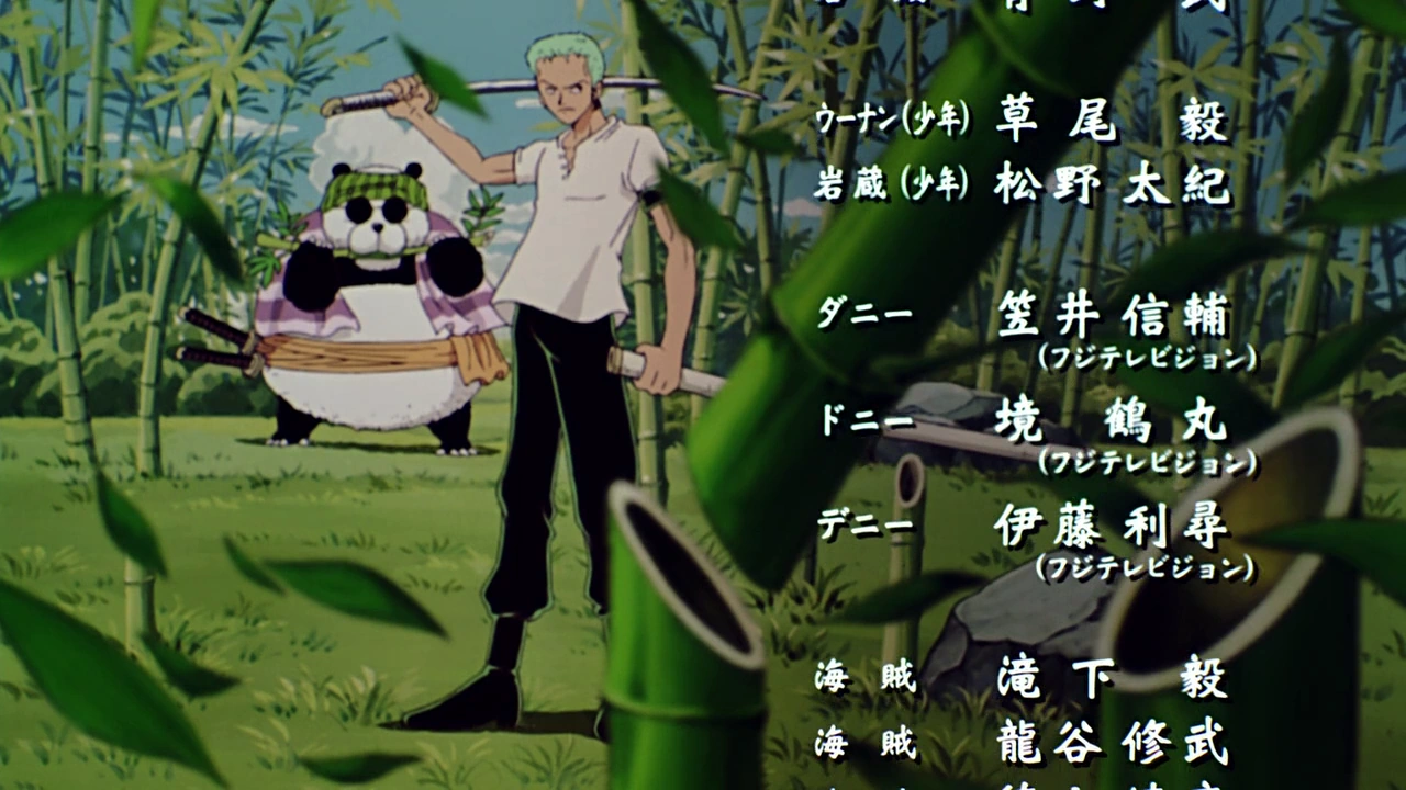 Animal Theater: Zoro cuts through a bamboo forest while his panda "trainer" follows behind, eating the stalks.