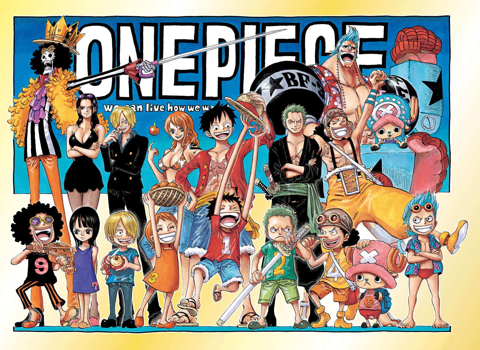 Color Spread: the Straw Hat Pirates pose with their younger selves. They each have a number on their clothing, matching the order in which they joined the Straw Hats. Some text in the background says "We can live how we want".