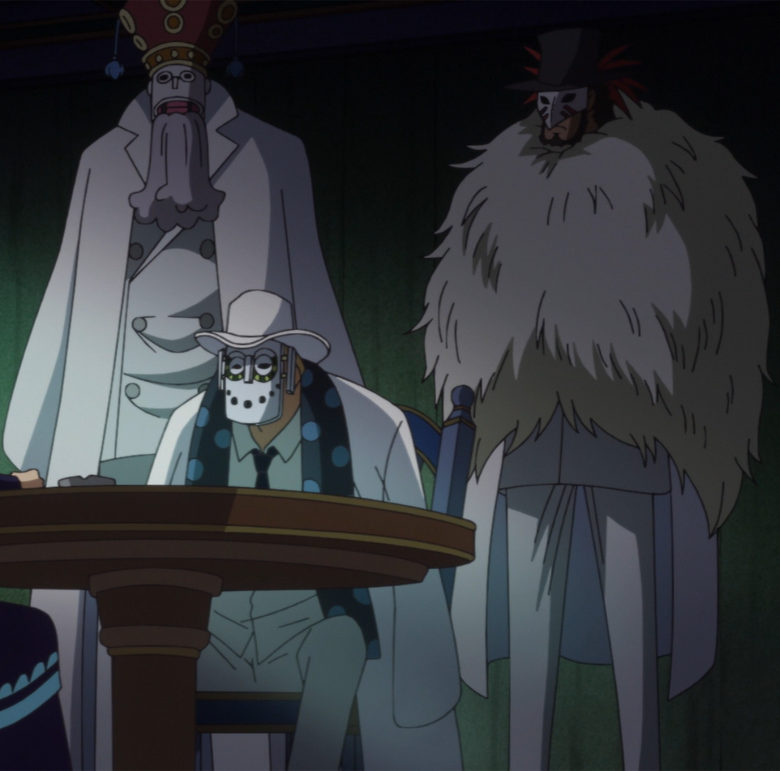 Meanwhile, at the Levely, CP0 made an appearance protecting St. Charlos from Leo and Sai, who attempted to attack him after the World Noble tried to enslave Princess Shirahoshi. In the end they left after St. Mjosgard told them to stand down. A few days later, they kidnapped Nefertari Vivi at the behest of their masters. She later managed to escape them with Wapol, who was causing a commotion as he fled the scene of a crime.