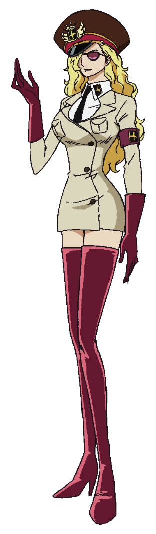 She is a slim woman with long, wavy blonde hair, with a tuft always covering her right eye, the left being obscured by a pair of sunglasses. She wears a modified version of the militaristic style uniform of many of the staff, consisting of a short pale brown double-breasted jacket worn like a dress over a white shirt with a black tie, all paired with brown boots and dark gloves far longer than the ones worn by the other members of the staff. On her head, she wears a standard Impel Down hat.[1]