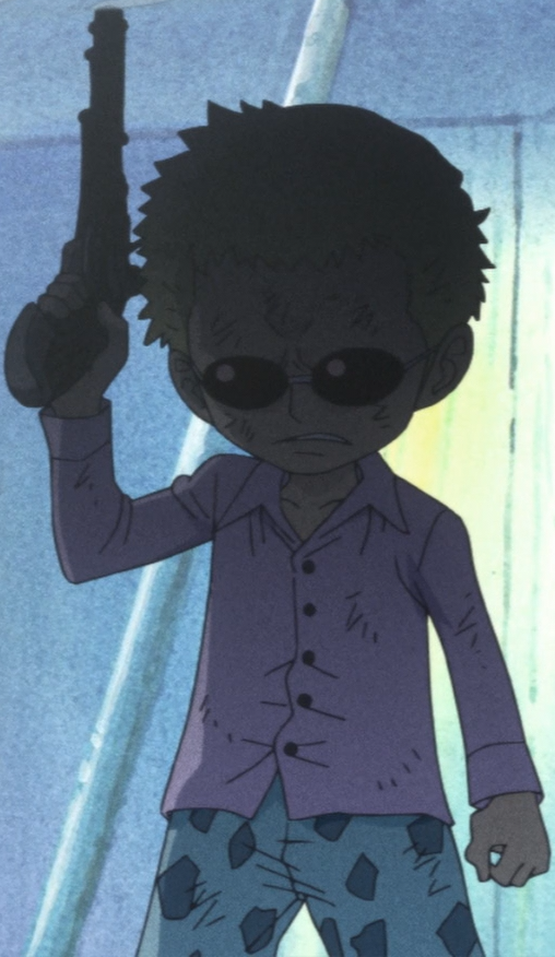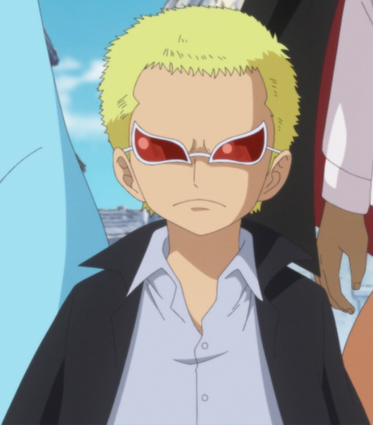 Even as a child, Doflamingo spent most of the time wearing sunglasses, though he had not yet acquired his trademark ones. Before leaving Mary Geoise, Doflamingo wear spiral sunglasses with dark-brown lenses he wore the typical garb of the Celestial Dragons, and his hair fashioned the same style of his adult self, but also curled upwards typical of the World Nobles. After the family left Mary Geoise, his hair was changed to a simply neat and tidy in a bowl cut and his wardrobe consisted of simple fine clothes: a low-neck button-up shirt with black striped and a frilled cravat.[26] However, due to the harsh life on the run from angry citizens, Doflamingo's appearance started to turn more disheveled;[17] in a depiction, his shirt and hair grew messier and unkempt, going barefoot, sitting on a tattered chair near palm trees, smoking a cigarette.[27]