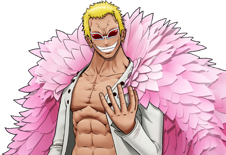 He is the first son of the late Donquixote Homing[17] and the older brother of the late Rosinante,[18] both of whom he killed out of feeling betrayed by them.[19][18] Doflamingo became the King of Dressrosa after taking the throne from Riku Doldo III eight years before the start of the series.[20] He ruled the country tyrannically until he was stripped of his positions as a Warlord of the Sea and king after he was defeated by Monkey D. Luffy near the end of the Dressrosa Arc. After Doflamingo was arrested by AdmiralFujitora along with most of his crew,[21] he was locked up at Impel Down and placed in Level 6.[22]Vegapunk later cloned Doflamingo as one of the Seraphim to replace the Warlords.[23]