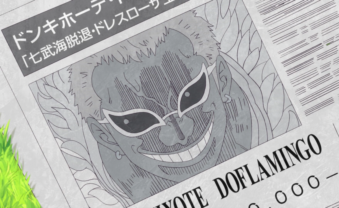 ↑ 4.04.14.2One Piece Manga and Anime — Vol. 69Chapter 682 (p. 6) and Episode 608, Doflamingo's romanized name is seen as he appears after the two-year timeskip.