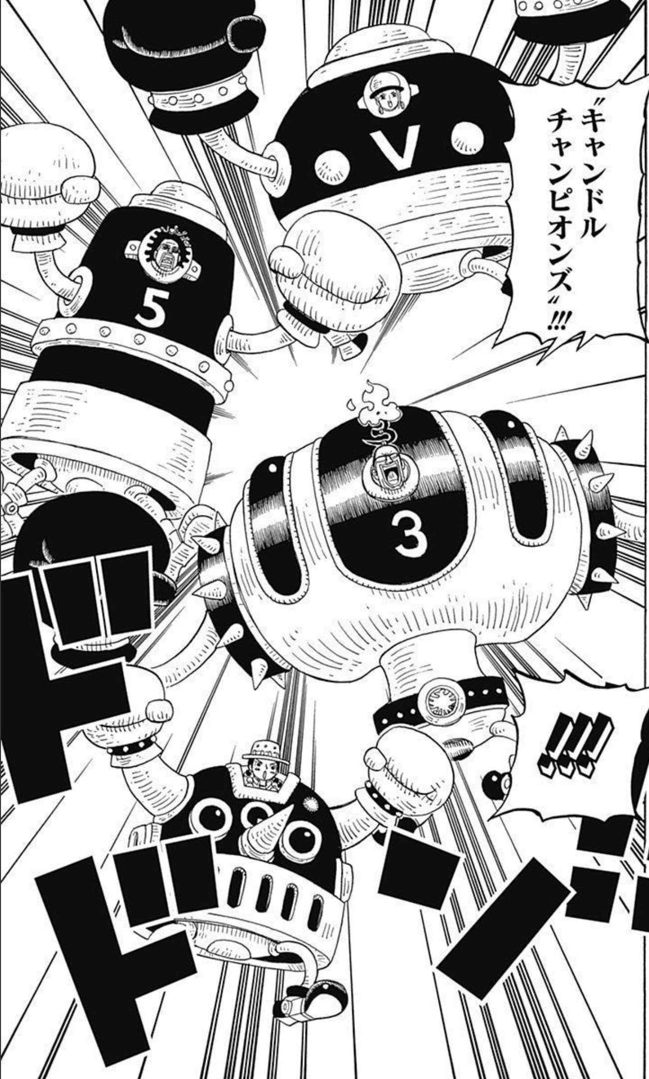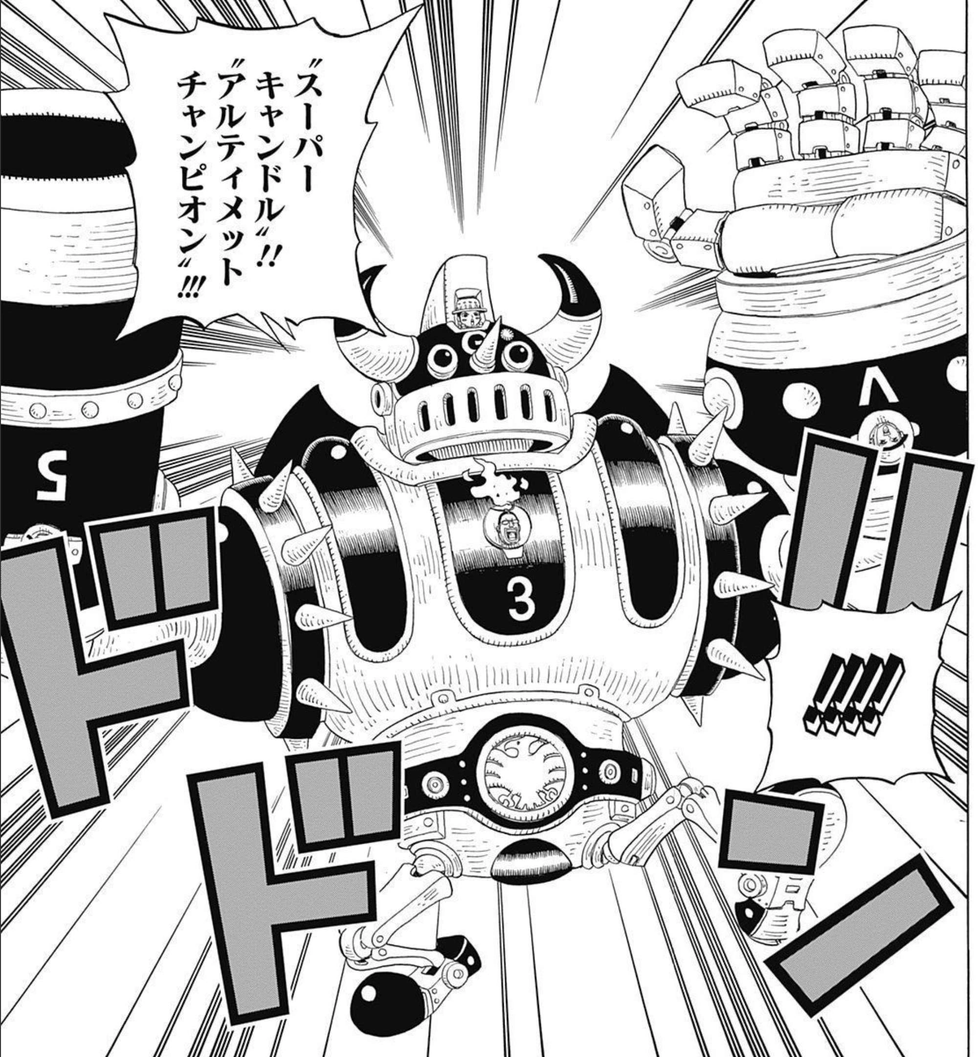 Candle Champion (キャンドル・チャンピオン,Kyandoru Chanpion?): Covering himself in wax, Mr. 3 makes a massive battle suit that resembles a large robotic boxer. The suit greatly enhances his physical power and defenses. It is so strong that Mr. 3 was able to defeat a pirate with a 42,000,000 bounty. Because of this, it is thus considered Mr. 3's best piece of art. The suit is generally white, however with Miss Goldenweek's painting abilities, the suit can be colored. This was first seen being used against Luffy.[21]