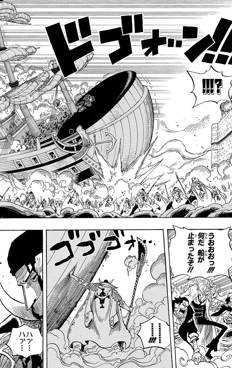 - ↑ One Piece Manga and Anime — Vol. 58 Chapter 566 (p. 10-14) and Episode 475, Whitebeard uses Oars and a hidden paddle ship to bypass the siege wall.
