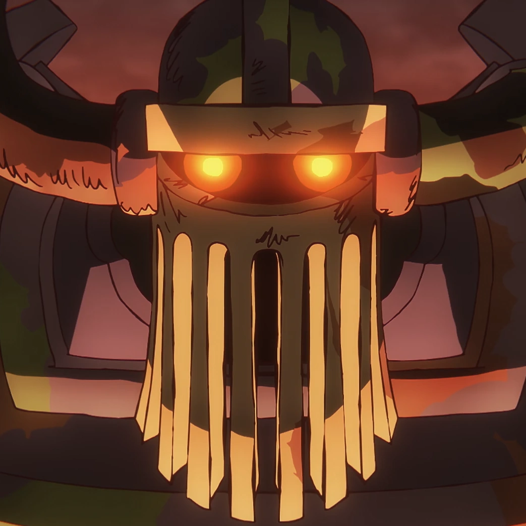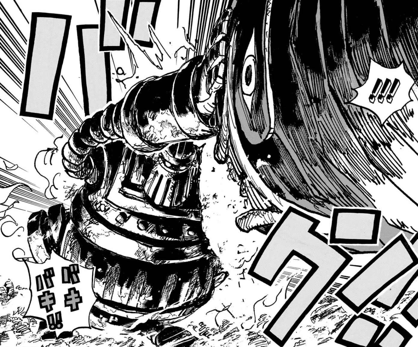 During Luffy's battle against Kizaru, he activated Gear 5, which led to the Drums of Liberation reaching Emet, causing its eyes to light up.[6] When Luffy later activated his Gear 5 form again, the Drums of Liberation triggered Emet to start moving.[13] Fully awake, Emet walked through the flames from the Buster Call and mentally apologized to Joy Boy.[8] As Emet continued to make its way across Egghead, Marines surrounding the island attempted to bombard it. Despite the heavy bombing, Emet was undeterred, and continued on its route with little issue.[14]York later determined that Emet was protecting the Den Den Mushi that Vegapunk was using to broadcast his world-wide message.[15]