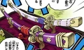 After Hiyori begged Roronoa Zoro to leave the stolen Shusui, a Great Grade sword, in its rightful place as a national treasure in Wano though he earned the sword from its previous zombifiedowner, she offered Enma as an equal replacement.[4] Zoro agreed to Hiyori's proposal to return Shusui for Enma, despite Kawamatsu's initial protest.[1] Upon gaining the sword from Sukiyaki, Zoro tried it out and learned of its distinct properties, to which he accepted, and trained during the time before the raid on Onigashima to gain further mastery over Enma.[3] During the Fire Festival, Zoro managed to gain some control over Enma's special trait,[15] but he hasn't succeeded in mastering it.[16][17] During his fight with King on Onigashima, Zoro realized that Enma was merely testing him and his suitability to wield the sword.[18]