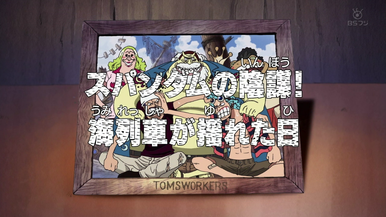 A long flashback dates back to eight years ago with the people of Water 7 enjoying the Sea Train Puffing Tom that Tom has his crew built. Two people explain that the Judicial Ship will be arriving soon and are positive that they'll let Tom go. Other people are a little worried that other islands want more for their items but aren't going to give up. Elsewhere, Iceburg can be seen constructing and says that the people are happy about being able to cross the ocean but they complain saying it's not good what they have hoped. However, Tom laughs at this saying they're spirits are up and see how time will tell. Suddenly, a group of men walk up and one of them starts talking to him. However, the man gets blasted by a cannonball but introduces himself as agent Spandam of CP5. It turns out that the cannonball came from Franky who is celebrating his recent kill of a Sea King using his newest Battle Franky 35. Iceburg is annoyed at Franky's childish behavior and starts pounding at Franky's battleship. Franky tries to stop him but Iceburg knocks him down and abruptly tells Franky that the battleships are dangerous and that someone else could get a hold of one and use it to harm others. Tom (with Spandam still following) shows up and Iceburg wants Tom to back him up on Franky not building any more ships. Spandam suddenly speaks up wanting to talk with Tom and Tom assumes that he wants to talk about the trial. However, Spandam doesn't know about any trial but only wants to talk about something.