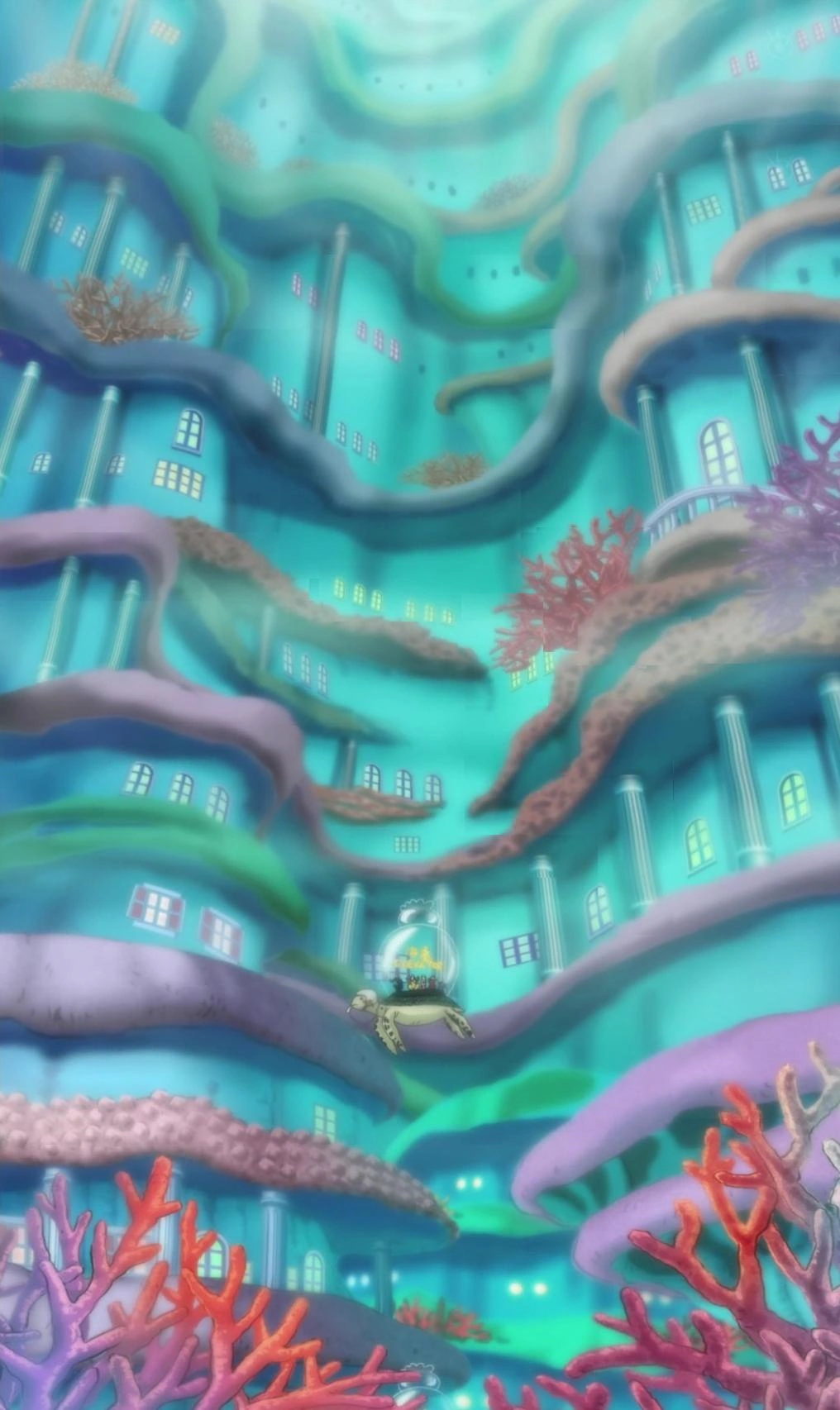 Fish-Man Island is said to be an underwater paradise. Because it is underwater, the only way for a conventional ship to get there is to be coated with a special resin found in the Sabaody Archipelago, and all ships entering the island must undergo a customs inspection.