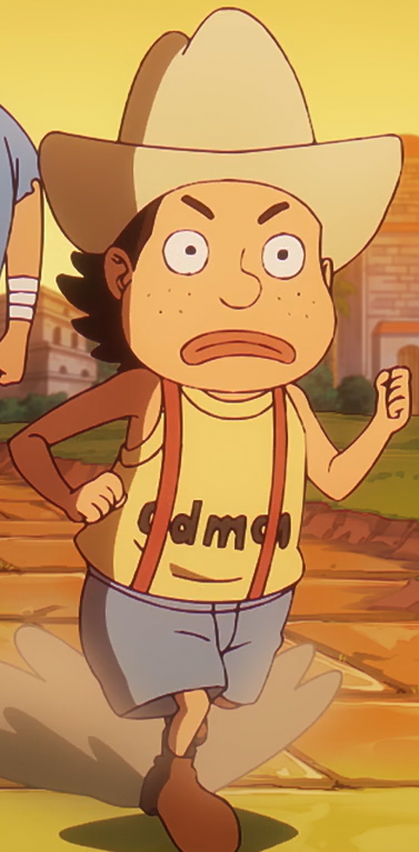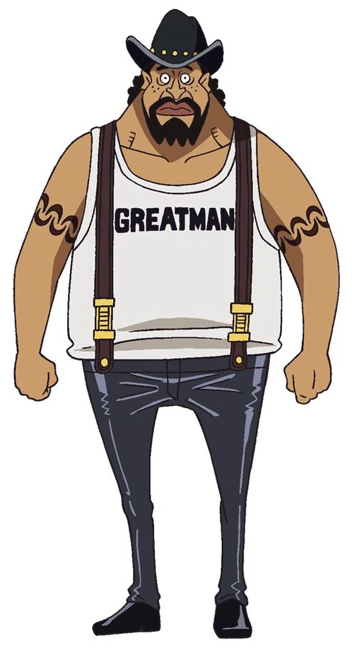 Gyogyo wears a tank top with the phrase "GREAT MAN" printed on it, trousers with a pair of suspenders, and a cowboy hat.[1]