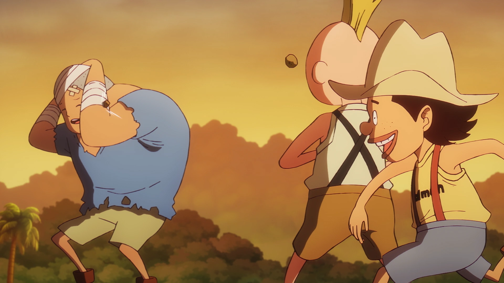 Gyogyo and Totts throw rocks at Kuma.