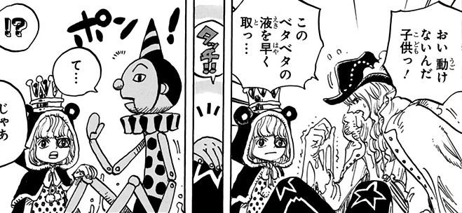 - ↑ 17.0 17.1 SBS One Piece Manga — Vol. 75 (p. 162), Sugar's biological and chronological ages are revealed.