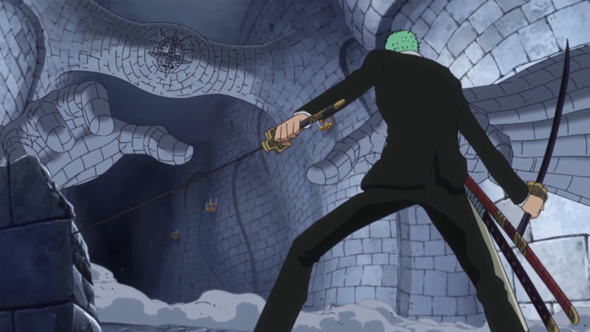 - ↑ 4.0 4.1 One Piece Manga and Anime — Vol. 74 Chapter 740 (p. 3) and Episode 673, Zoro cuts down pieces of Pica with no end.