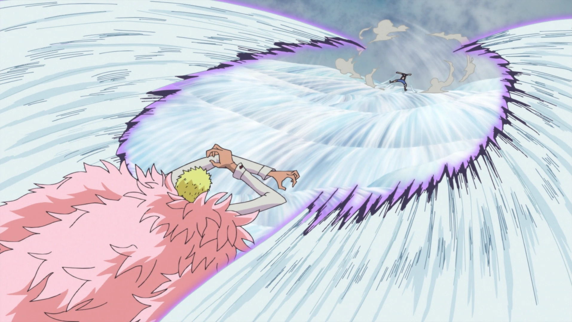 Doflamingo uses Flap Thread against Luffy.