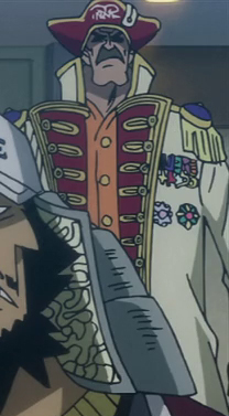 Unlike other Marines, his traditional white robe is customized, with yellow accents, red borders, and a richly decorated collar. He also carries awarded medals on his left breast, signifying his important rank and status. He wears a traditional red bicorne hat with the Marine's symbol. Unlike other high-ranking Marines, he actually wears his marine coat with his arms in the sleeves. Underneath that, he wears an orange shirt, simple loose pants and boots. Overall, he appears to be a well decorated Marine. He also wields a katana that fits his size, slung over his shoulder.