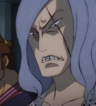 Jujiro joined Denjiro's southern forces.[10] The group ran into Sasaki, but due to his relationship with Denjiro, they were able to shackle him.[11] The southern forces then invaded the Live Floor, and Jujiro participated in a force stopping Beasts Pirates members from approaching the Scabbards.[10]