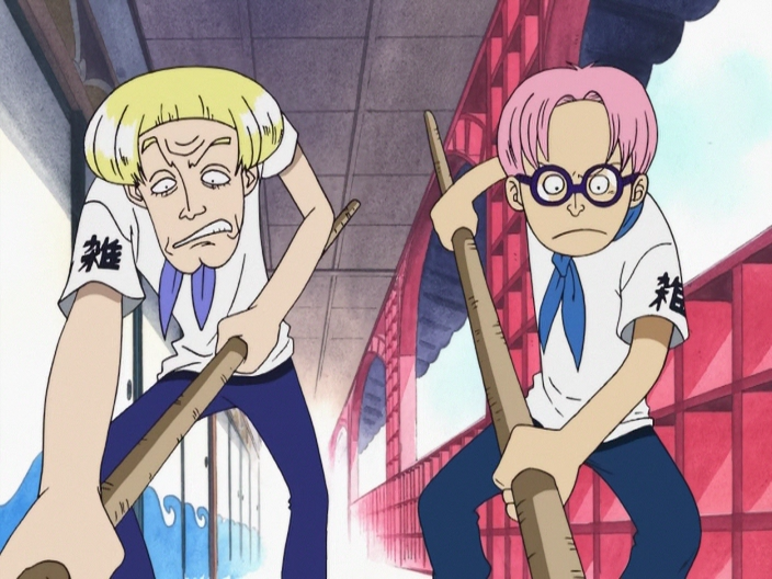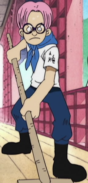 - ↑ One Piece Manga and Anime — Vol. 10 Chapter 84, cover story: Diary of Koby-Meppo Vol. 2 and Episode 68, Koby wears a shirt with 雑 (short for 雑用, meaning chore boy) and is seen doing chores at the Shells Town Marine Base.