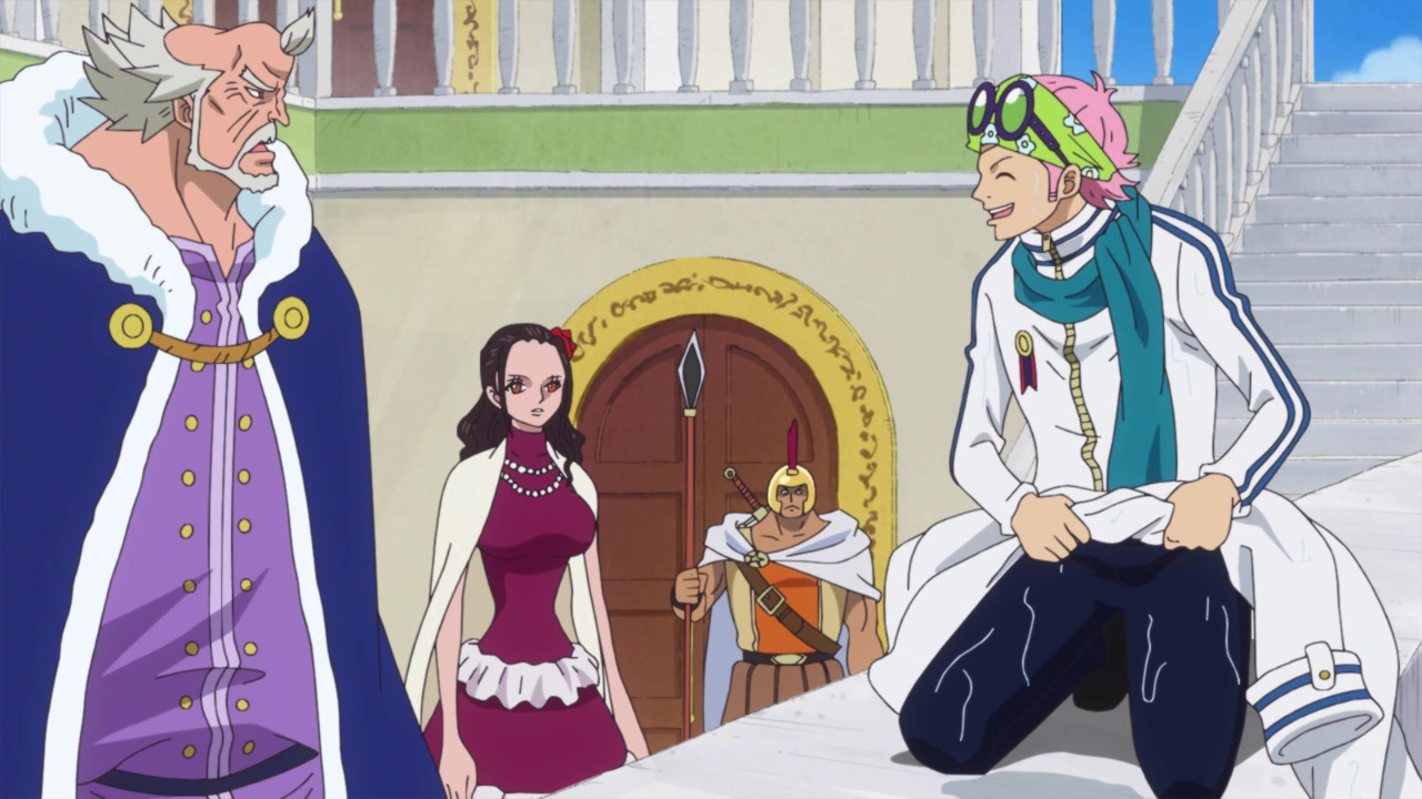After the dissolution of the Seven Warlords of the Sea, Koby was sent to capture Boa Hancock, who herself was preparing to fight back. He offered Hancock a peace solution which is to surrender herself and come with the Marines just so the World Government will spare her people, only for her to angrily refuse and turn most of the Marines into stone, save for Koby. He seems currently unaware, however, of her affiliation with Luffy.